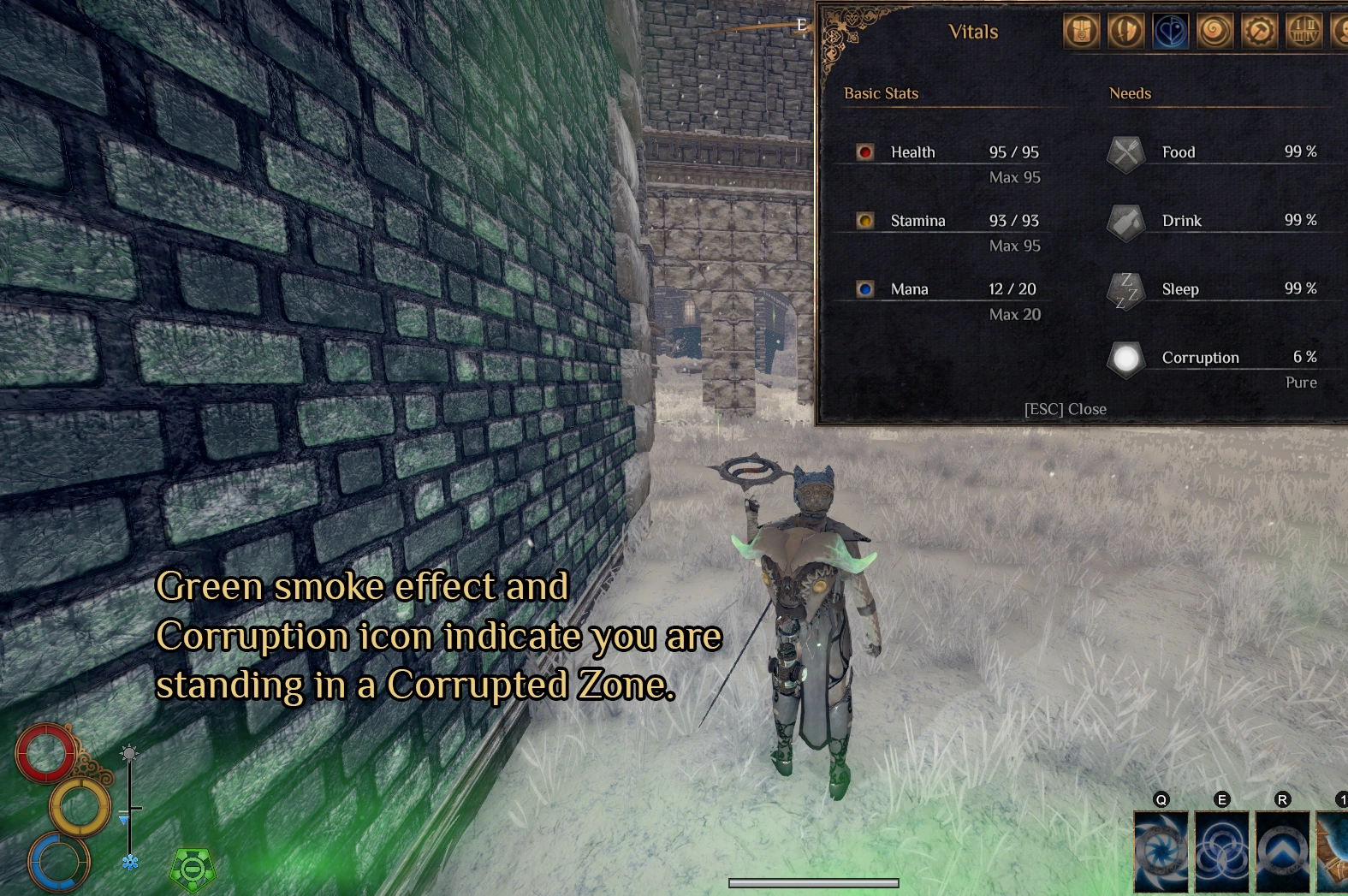 A player standing in a Corrupted Zone, indicated by the green smoke effect and the Corruption icon at the bottom of the screen.